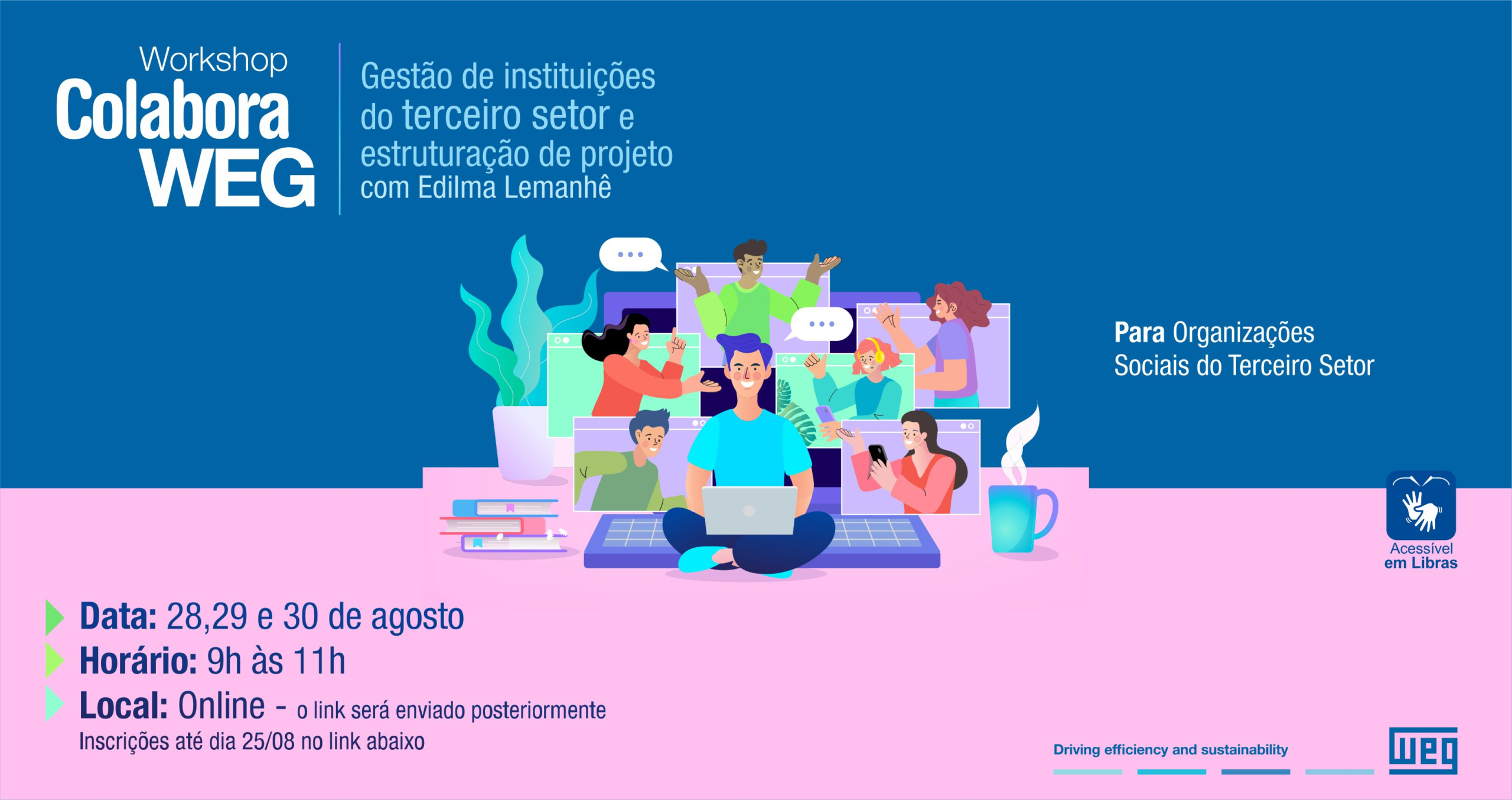 Com foco em organizações sociais do terceiro setor, a WEG promove o Colabora WEG. O evento acontece nos dias 28, 29 e 30 de agosto, das 9h às 11h, de forma online.
