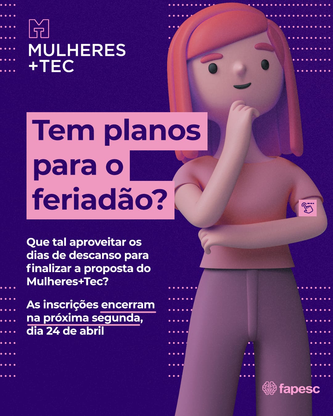 As inscrições para o Programa Mulheres + Tec encerram-se na segunda-feira, dia 24 de abril. O objetivo é aumentar a participação feminina no ecossistema de Ciência, Tecnologia e Inovação (CTI) de Santa Catarina através do financiamento de 20 startups lideradas por mulheres. Ao todo, o edital vai destinar até R$ 1,8 milhão oriundos do orçamento da fundação.