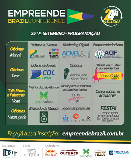 As palestras estão divididas por períodos (manhã, tarde, noite, madrugada) e mais detalhes dos conteúdos e inscrições podem ser consultada no site www.empreendebrazil.com.br.