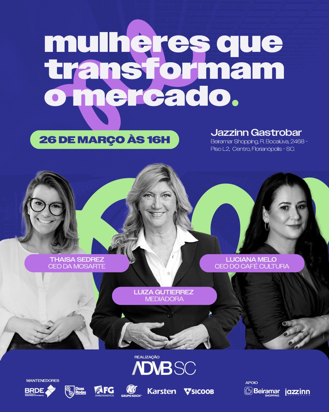 A programação contará com a participação das empresárias catarinenses Luciana Melo, CEO do Café Cultura, e Thaisa Sedrez, CEO da Mosarte, e Melina Costa, diretora de comunicação da ADVB/SC, com mediação conduzida pela jornalista e colunista do Notícias do Dia, Luiza Gutierrez.