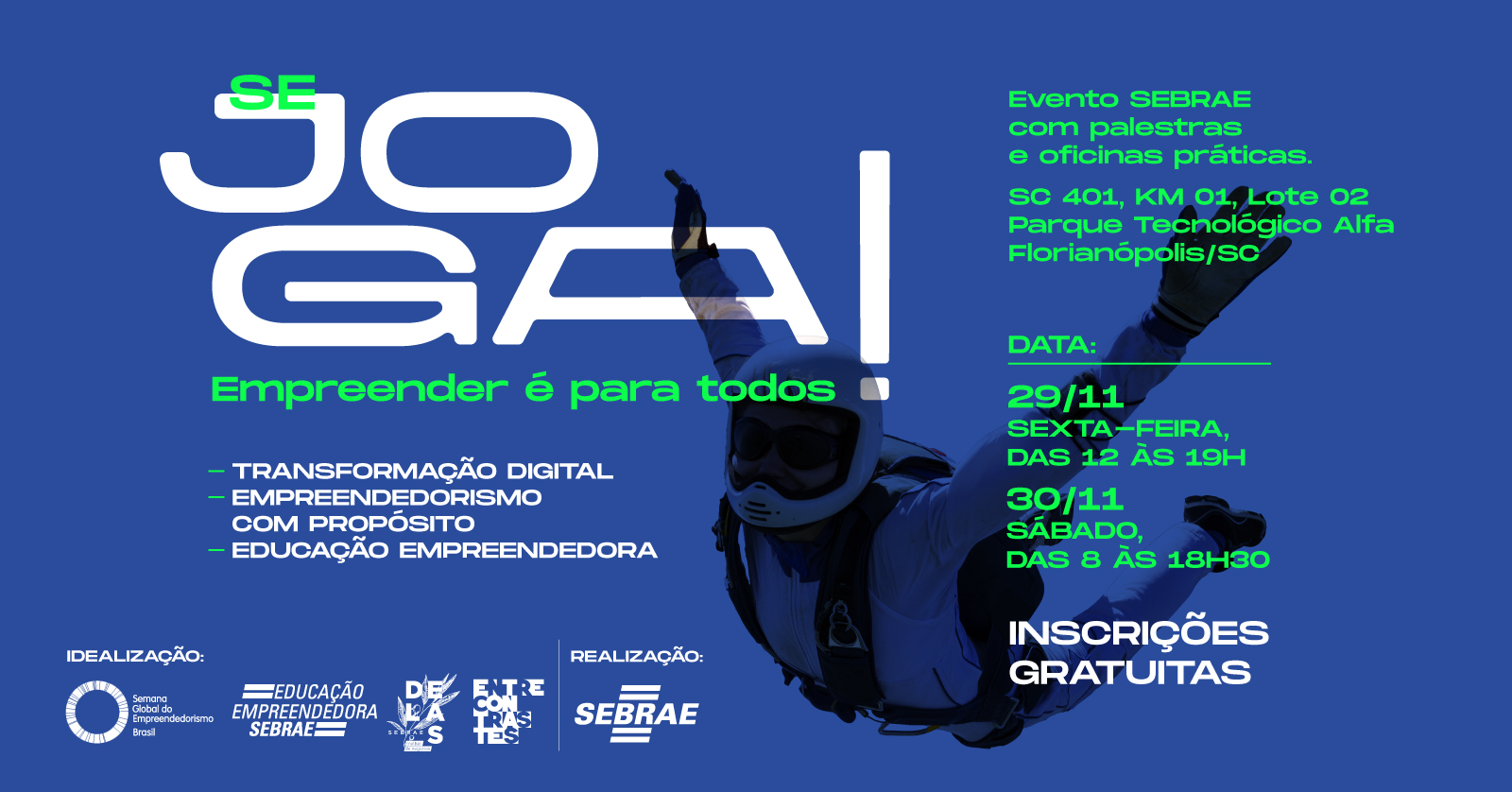 Nos dias 29 e 30 de novembro, o Sebrae promove a primeira edição do “SE JOGA! Empreender é para todos”. O evento foi idealizado para estimular o empreendedor a melhorar sua performance e a aprimorar seus conhecimentos sobre empreendedorismo e inovação. Para isso, serão mais de 36 horas de oficinas e conversas sobre educação empreendedora, transformação digital e empreendedorismo com propósito. O evento é gratuito e as inscrições podem ser feitas pelo http://sebrae.sc/sejoga .