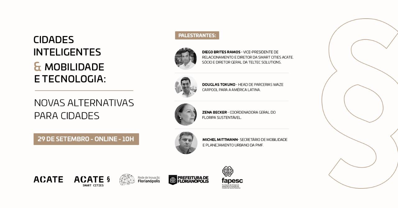 O encontro irá reunir especialistas com diferentes perspectivas, com um bate-papo de Diego Ramos, vice-presidente da ACATE e diretor da Vertical Smart Cities; Zena Becker, presidente do Movimento Floripa Sustentável; Douglas Tokuno, head de Parcerias e Waze Carpool para a América Latina, e Michel Mittmann, secretário de Mobilidade e Planejamento Urbano da Prefeitura Municipal de Florianópolis.