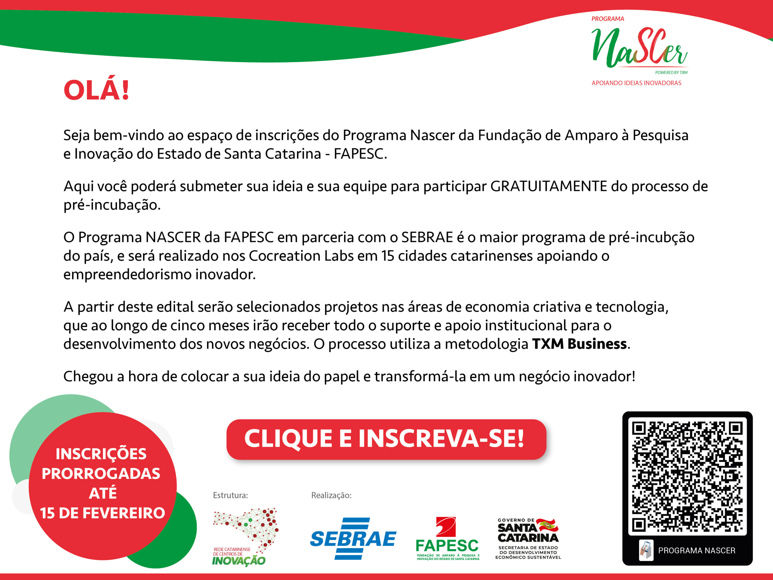 Foram prorrogadas até o dia 15 de fevereiro as inscrições para o Programa Nascer, da Fundação de Amparo à Pesquisa e Inovação do Estado de Santa Catarina (Fapesc) em parceria com o Sebrae. O objetivo da pré-incubação é transformar o conhecimento tecnológico em novos produtos, processos ou serviços para serem explorados no mercado.